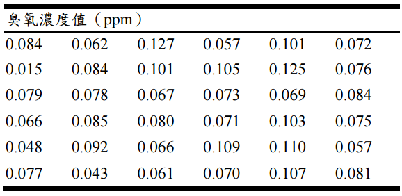 【已刪除】五、有一位工礦衛生技師在其所服務的工廠內使用直讀式儀器,在八小時的工作時間內 隨機量測到以下 36 筆接近常態分布的臭氧濃度值。請問這家工廠 8-hr TWA 臭氧的 95%信賴區間的上下限暴露值各為多少?