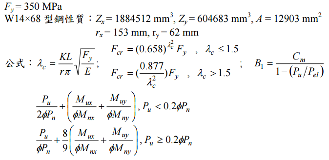 【已刪除】三、有一鋼造斜撐構架系統,經過載重組合分析後得柱軸力 800 kN,柱底端強軸彎矩為 100 kN-m,弱軸彎矩為 50 kN-m,柱底端為固接端,另一端為鉸接端,此柱在強軸 及弱軸的有效長度(KL)均為 4.5 m,請利用極限設計法(LRFD)檢核此柱所承受 之軸力彎矩需求強度比是否符合設計需求。(25 分) 柱為 ASTM A572 Gr.50 之 W14×68,鋼材及斷面性質如下:
