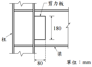 【已刪除】四、如下圖所示鋼結構梁柱接頭示意圖,梁翼板與柱採用全滲透銲接,梁腹板與柱的剪 力板(180 mm 長及 80 mm 寬)採用栓接,經過載重組合分析後得梁剪力 180 kN, 假設柱的剪力板只傳遞梁剪力至柱,請依極限設計法(LRFD)設計剪力板的厚度 及所需的螺栓數目,並以圖示方式說明螺栓於剪力板的配置(距柱面 40 mm 處)。 螺栓採用直徑 20 mm 的 A325 承壓型強度,螺栓標稱剪力強度為 330 MPa,剪力板 材質為 A36 鋼板。(25 分) 剪力板材質:F