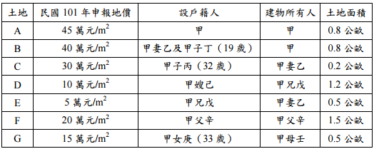 【已刪除】三、某甲位於 T 市擁有 7 筆土地,均為都市計畫住宅區之土地,其各筆土地之申報地價 分別如下表所示。如民國 101 年地價稅開徵,T 市民國 101 年累進起點地價為新臺 幣(下同)1000 萬元,甲各筆土地上之建物均無出租或供營業使用,且建物為合法 登記之建物,均作為住家使用。請計算某甲民國 101 年該 7 筆土地應繳的地價稅總 額。(25 分)