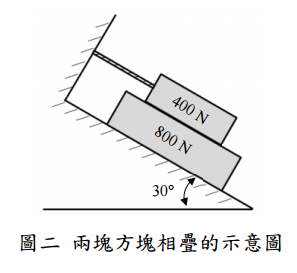 【已刪除】二、若 800 N 的方塊與地面的靜摩擦係數是 0.2,請問兩個方塊間的靜摩擦係數要剛好小 於多少時,800 N 的方塊才能向下滑動,此時此摩擦係數可定義為臨界靜摩擦係數。 若兩個方塊間的靜摩擦係數剛好等於此臨界靜摩擦係數,此時繩子的張力是多少? (25 分)