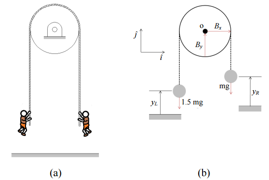 【已刪除】一、如圖一所示,若滑輪與繩索的摩擦及繩索的重量皆不計,繩索無法拉伸,在一開始 處於靜止不動的狀態,左邊人員的重量是右邊人員重量的1.5 倍,若左邊的人員懸掛 在繩索上不動,請問右邊的人員往上爬的速度要多快,左邊人員才能維持在一開始 的位置。(25 分)