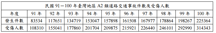 【已刪除】三、請說明下列表格內容在交通行政上的意義(分析解釋 A2 類道路交通事故件數及受 傷人數、十年的趨勢、相關行政機關的因應對策等)。(25 分)