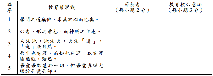 【已刪除】四、古今中外任何一位為世人所景仰的重要思想家,其教育哲學觀往往蘊含許多深層哲理, 雖不一定包括全面性的教育歷程,但卻常具重大啟發意義。試問下表中,影響後人深 遠的「教育哲學觀」是由誰最早提出來的(如係外國人,音譯雷同者即給分)?並請 進而申述其核心意涵。(25 分)