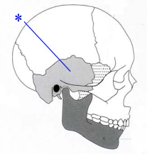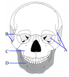 (A)顳骨(temporal bone) (B)額骨(frontal bone) (C)顴骨(zygomatic bone) (D)上顎骨(maxilla)