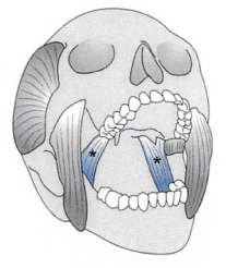 (A)此肌肉應為翼外肌(lateral pterygoid muscle) (B)此肌肉應為翼內肌(medial pterygoid muscle) (C)此肌肉屬於顏面肌群(facial expression muscle) (D)此肌肉與顳顎關節之功能及活動完全無關