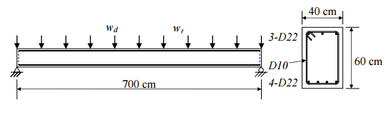 【已刪除】二、有一簡支梁,斷面尺寸及配筋如圖所示,支撐中心跨距L=700 cm,此梁承受均佈靜 載重(含梁之自重) w