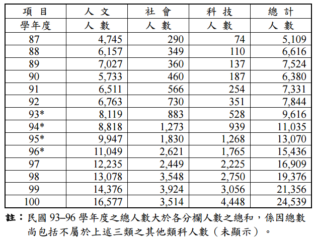 【已刪除】四、民國 87–100 學年度外國留臺學生人數統計表(依領域分類)如下:
