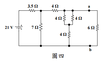 【已刪除】三、有一電路如圖四所示,試求出 6 Ω 電阻器所吸收之功率。(20 分)