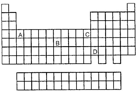 18. Which element, indicated by letter on the periodic table shown below, has a 2+ ion with the electron configuration \([\text{Ar}]3d^{10}\)?(A)A(B)B(C)C(D)D