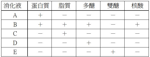 6. 附表為人體消化液的作用,有作用者記為(+)、無作用者記為(-),下列配對何者正確?(A) A—膽汁 (B) B—胰液 (C) C—小腸液 (D) D—胃液 (E)E—唾液。