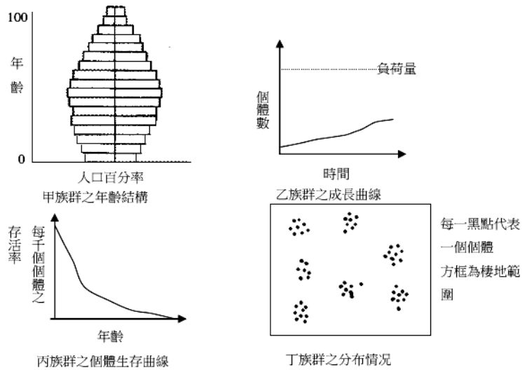(A)年齡結構中,幼年期的個體數小於或等於成年期個體數的族群(甲族群) (B)成長曲線中,族群個體數低於環境負荷量的族群(乙族群) (C)個體生存曲線為內凹型(第三型)的族群(丙族群) (D)呈叢生分布的族群(丁族群) (E)均不符合