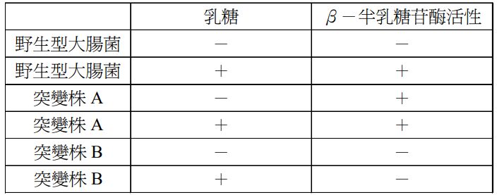 14. 一研究員分離出大腸菌乳糖操縱組的突變株 A、B,在培養基中不加入葡萄糖時,加入(+)或不 加(-)乳糖,測試是否有分解乳糖的β-半乳糖苷酶生成,其結果如附表,則下列敘述何者正確?