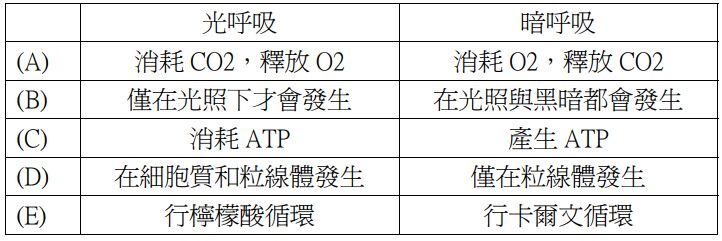 5. 光呼吸是所有使用卡爾文循環進行固定二氧化碳的細胞,在光照和高氧低二氧化碳情況下發生的一 個生化過程,下列有關「光呼吸」和「呼吸作用」之比較,何者正確? (A)(B)(C)(D)(E)