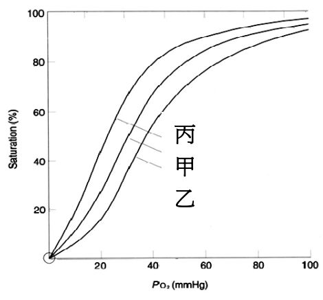 10. 右圖為血液中氧分壓(pO2)與氧合血紅素飽和百分比(%)的關係圖。圖中三條曲線,分別代表正常生 理狀態下(甲),及特定因素調控下兩者關係的變化(乙、丙),下列何者為正確的敘述?