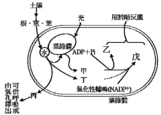 (A)甲發生於電 子傳遞鏈 (B)乙、戊可供三碳糖轉化為六碳糖 (C)丙 經由氣 孔排出 (D)此處的光波長必為 680nm 和 700nm 兩種 (E)此反應發生於囊狀膜 上。