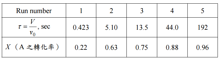 ;CSTR 內反應混合物體積 V 。請以下表之數據求出k 與α 之值。 (20 分)