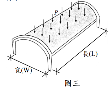 【已刪除】三、圖三所示之筒形薄殼系統,其長/寬比(length/width)大於 3 時,一般視為長筒薄殼 (long barrel)系統。試繪圖說明長筒系統與短筒系統在垂直分布載重 P 下(作用於殼 面)之結構行為。(20 分)