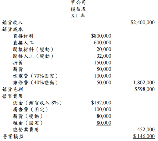 請依據上述資料為甲公司編製 X1 年彈性預算下之預估損益表。(20 分)