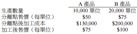 4 甲公司生產 A、B 兩種聯產品,10 月份投入$500,000 製造成本後,在分離點時相關資料如下: