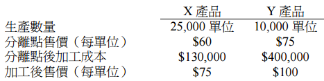 1 乙公司生產 X、Y 兩種聯產品,8 月份投入$750,000 製造成本後,在分離點時相關資料如下: