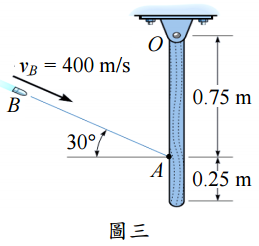 【已刪除】三、如圖三所示,質量 5 kg 的細桿以插銷定位於 O,起始時為靜止狀態。若有一 4 g 的子彈以 400 m/s 速度射入長桿 A 點內,試求當子彈嵌入桿子內的一瞬間,此桿子 的角速度為何?(20 分)