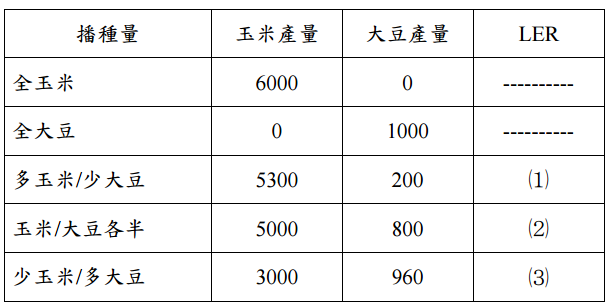 【已刪除】四、下表是玉米與大豆的間作試驗結果: 根據上表的數據分別計算⑴、⑵、⑶的間作效率 (Land Equivalency Ratio,LER), 並列出計算過程。(20 分)