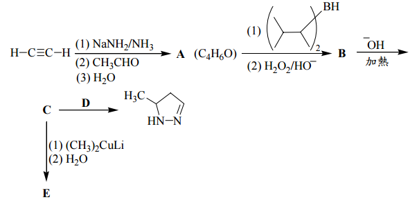【已刪除】四、寫出下列反應流程圖中所缺少的試劑,或形成的產物 A 至 E。(10 分)