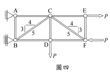 【已刪除】四、一簡單桁架(simple truss)承受如圖四所示之外力,在微小變形的假設下,試求支 承反力及各桿件之受力,表示成 P 的函數,桿件力以正號代表張力,負號代表壓力。 (25 分)