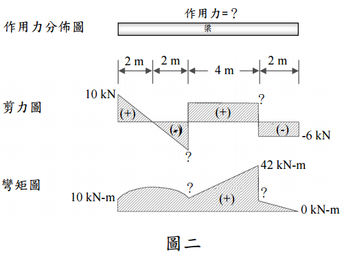 【已刪除】二、圖二為某一梁未完成之作用力分佈圖、剪力圖與彎矩圖,剪力圖各段皆為直線,試 完成此三圖並重繪於試卷上,圖中應標示此梁所受之荷載(包括外力、力矩、剪力 與支承反力等)。(25 分)