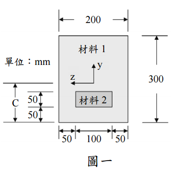 【已刪除】一、一複合梁(composite beam)由兩種材料所組成,其斷面(cross section)如圖一所 示,材料 1 的彈性係數(elastic modulus)為E1=2×10