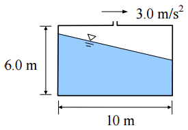 【已刪除】二、一個圓桶形狀的儲油槽,直徑10 m,高度6.0 m,油槽頂部有通氣孔與大氣接觸。 原本裝有深度為4.0 m的油(比重為0.84),在地震來襲時,水平方向之加速度為3.0 m/s2 ,試求油槽中最大壓力。(25分)