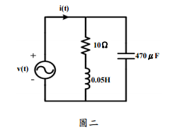 【已刪除】二、於圖二之交流電路中,若其均方根值(rms)交流電壓源為V=110∠0oV,頻率為 60Hz,求i(t),負載之平均消耗功率及功率因數。(20 分)