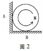 【已刪除】二、一個圓柱重量為 30 N,半徑為 5 cm 如圖 2 所示。此圓柱分別與牆壁和地面接觸於 A 點與 B 點,其接觸摩擦係數分別為 = 3.0 μ