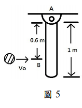 【已刪除】五、一根細長鐵桿質量為 6 kg 長度為 1 m,以插銷懸吊於 A 端。現有一球質量為 1 kg, 速度為 10 m/s 撞擊此鐵桿於 B 點處如圖 5 所示。假設球與鐵桿之碰撞回復係數 e 為 0.4。試問碰撞後球的速度為多少?(10 分)鐵桿的轉速為多少及鐵桿的動能為多 少?(20 分)