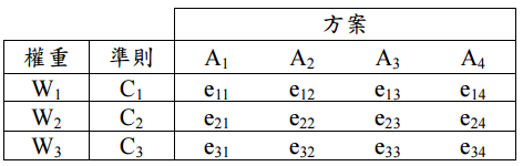 【已刪除】三、若有四個方案(A),其在三個準則下之績效值(e)及各準則(C)之權重(W) 為已知,如下表所示: