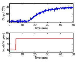 【已刪除】五、某兩個串聯式反應器,當第一個反應器加熱流控制閥之閥開度增加 10%後,第二個 反應器出口端之溫度變化如圖所示。試據此估算一階帶時延模式之參數值(方式不 限,參數不要求太精準)。(10 分)