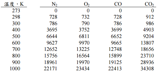 C)為-393.51 仟焦耳/莫耳,不同氣體隨溫度 變化之燃燒氣焓值(enthalpies of combustion gases,焦耳/莫耳(J/mol))數據如下: