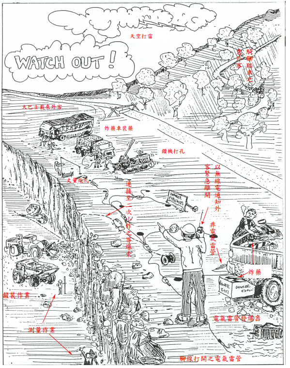 【已刪除】一、此為一常見之露天階段開炸作業示意圖,內含十個會產生意外引爆或失炸之不安全 動作,身為礦場安全管理人員的你,有責任及義務找出並糾正這些錯誤,請根據圖 內之說明判斷這些危險因素,挽救自己及他人之生命財產。(20 分)