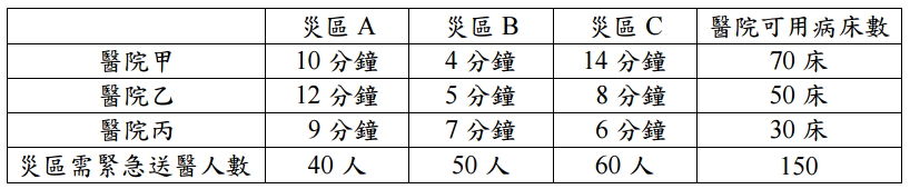 【已刪除】一、假設某一區域突然發生了天然災難,受創最嚴重的主要地方有三處(災區 A、B、C 三處),各災區急需送醫的民眾人數如下表所示。經緊急查詢鄰近地區醫院可用病 床數亦如下表所示。由於三個主要災區與三個可提供病床醫院的相對區位不同,下 表亦顯示每一災區運送重傷患到每一醫院所需的運輸時間。因為救災運送時間亟為 關鍵,影響重傷患存活率,為了降低重傷患運送到醫院的總運輸時間,請找出最佳 分配解,並計算總運輸時間?(25 分)