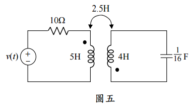 【已刪除】五、圖五之電路中,試求出其中耦合電感之耦合係數(coupling coefficient)k。若電源 v(