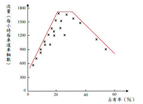 【已刪除】二、交通控制常須仰賴車輛偵測器蒐集交通特性資料作為控制的依據。由歷史資料分析 得知,某一路段之流量-占有率關係圖如下,試問此一路段之容量及其所對應之占有 率(occupancy)分別為多少?(5 分)現測得流量為每小時每一車道 800 輛車,試 問此時之交通狀況如何?其理由何在?(5 分)已知採用感應線圈式車輛偵測器 (inductive loop detector)進行偵測,線圈長度為 3 公尺,且通過此一路段車輛之平 均車長為 5 公尺,試問車流密度(density)達多少時,車流量達到容量的水準? (10 分)