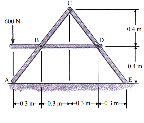 四、如圖所示,試求固定支承 E 和光滑支承 A 處之反力。圖中 B 點為鉸接,D 點為一 滑槽(smooth slot)。(25 分)