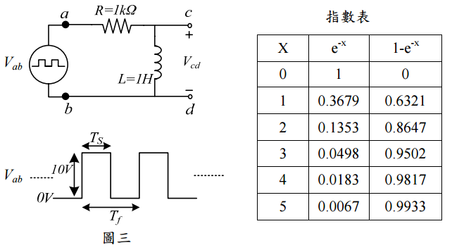 【已刪除】四、如圖三,若ab兩端輸入週期性方波之電壓訊號Vab,振幅電壓為 10V,頻率 100Hz,任 務週期(Duty cycle)為 50%,T