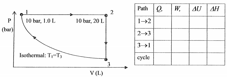 is taken through the cycle in the following diagram in the direction indicated by the arrows. Calculate Q, W, △U and AH in kJ for each segment (1→2; 2→3; 3→1) and for the cycle. Display your final answers in a Table like one below on your answer book. (30 points)