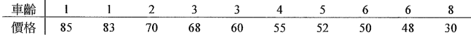 【已刪除】5隨機調查10輛同款式BMW 二手車的車齡與售價(單位:萬元) ,得資料如下: