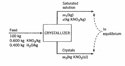 at 80°C is fed to a cooling crystallizer in which the temperature is reduced to 40°C. Determine the temperature at which the solution reaches saturation and the percentage of the potassium nitrate in the feed that forms crystals. (30%)