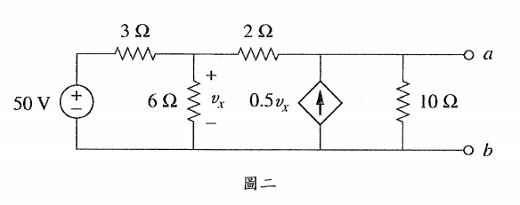 【已刪除】2. (20%)考慮圖二的電路,求a-b兩端間的戴維寧等效電路(Thevenin's equivalent circuit)。