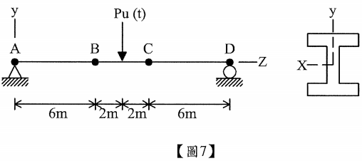 【已刪除】九、有一跨度16 m之鋼梁如下【圖7】所示,為一結實斷面型鋼,梁中點承受一集中載重Pu ,在A、B、C、D均有承壓能力良好之侧支撐,毋需考慮撓度及剪力,且不計梁自重, 請依極限設計法(LRFD)求此梁能承受之最大係數化集中載重Pu。(15分)