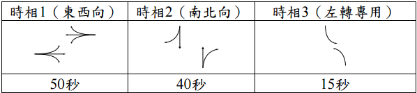 【已刪除】二、有一個三時相號誌化路口,其時制計畫如下圖所示。假設時相 3 的左轉車流之到達 m xe−m 型態服從卜瓦松機率分配(Poisson distribution):